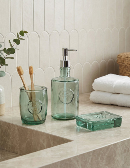 Contrairement à d'autres accessoires de salle de bain qui ne se recyclent pas, comme ceux en céramique ou en plastique, notre gamme d'accessoires en verre pour la salle de bain est produite à 100% partir de verre recyclé.