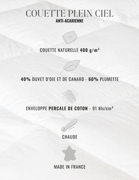 Couette naturelle - Chaude - 40% duvet anti-acarienne PLEIN CIEL
