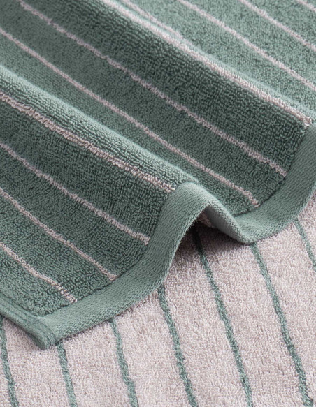 Tissée en éponge jacquard dans nos ateliers, elle arbore un motif à fines rayures double face qui apporte une touche raffinée à votre salle de bain. Grâce à son tissage sophistiqué, le jacquard offre un relief subtil et une couleur différente sur chaque face: Indigo avec revers Beige, et Lichen avec revers Beige.