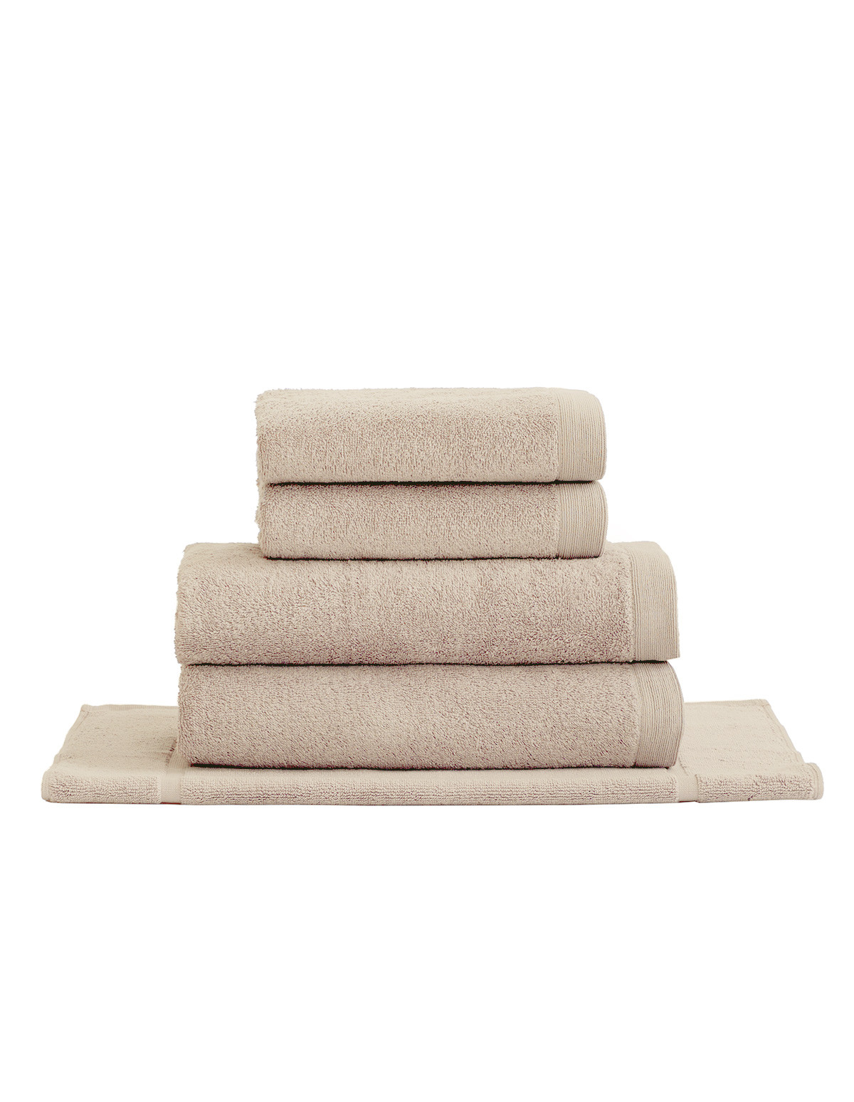 Cet ensemble STUDIO est composé de 5 pièces: 2 serviettes de toilette (50x90 cm), 2 draps de bain (70x130 cm) et 1 tapis de bain (50x70 cm)