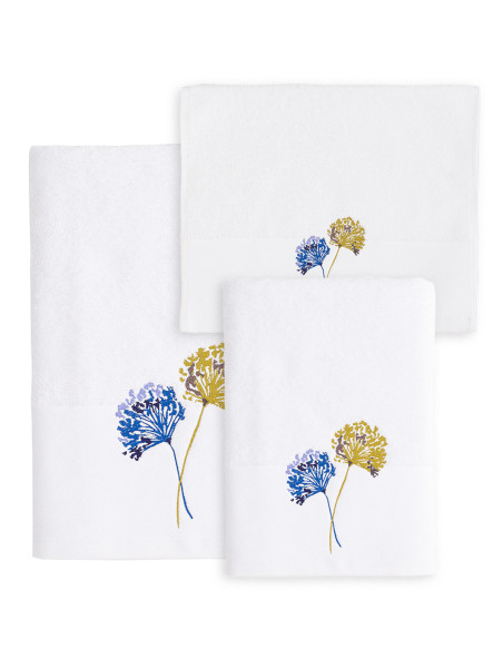 L'ensemble comprend 1 drap de bain 70x140 cm, 1 serviette de toilette 50x100 cm et 1 serviette d'invité cm.