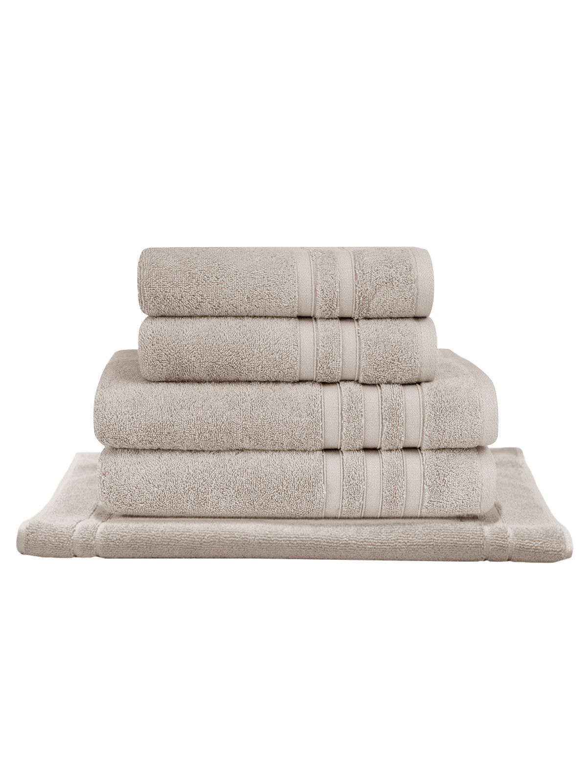 • Set complet 5 pièces : 2 serviettes 50x100 cm, 2 draps de bain 70x140 cm et 1 tapis 50x80 cm