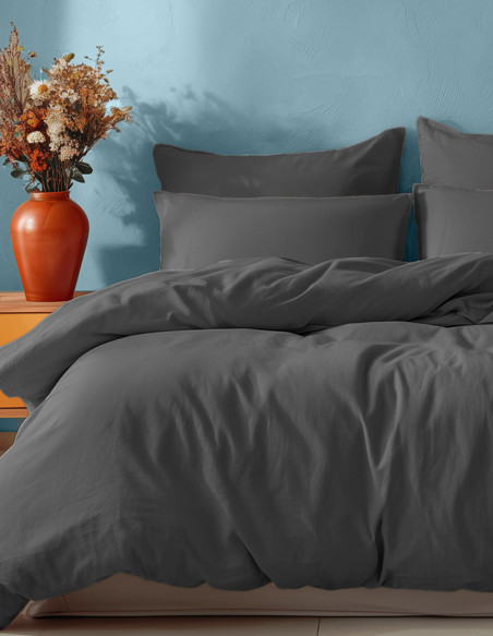 Cet ensemble de 3 pièces se compose d'une housse de couette avec choix de dimensions (140x200 cm, 200x200 cm, 240x220 cm, 260x240 cm) et de 2 taies d’oreiller carrées 65x65 cm.