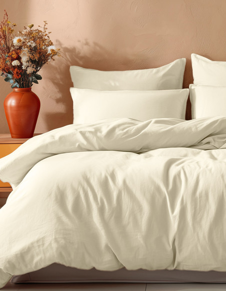 Cet ensemble de 3 pièces se compose d'une housse de couette avec choix de dimensions (140x200 cm, 200x200 cm, 240x220 cm, 260x240 cm) et de 2 taies d’oreiller carrées 65x65 cm.