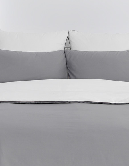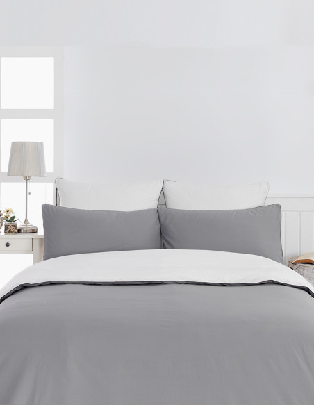 La parure de lit  DOZMARY en 100% percale de coton de 80 fils/cm² arbore un style bicolore tout en souplesse. Elle est composé d'une housse de couette au choix et de 2 taies d'oreiller carrées 65x65 cm, toutes réversibles.