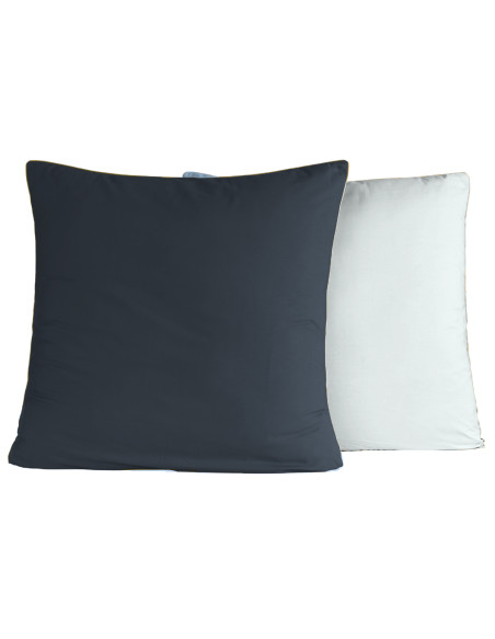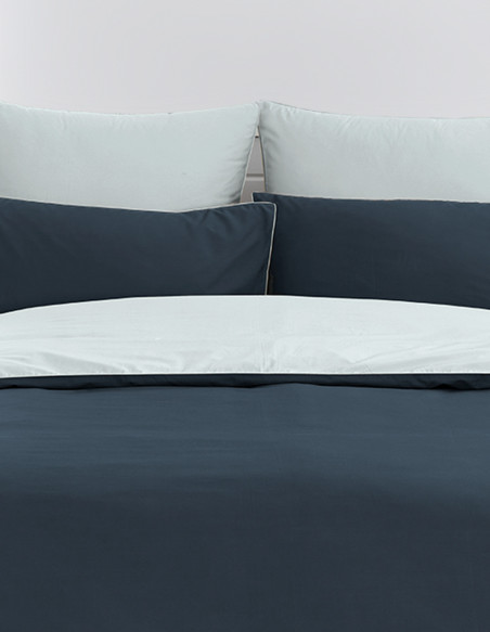 La parure de lit  DOZMARY en 100% percale de coton de 80 fils/cm² arbore un style bicolore tout en souplesse. Elle est composé d'une housse de couette au choix et de 2 taies d'oreiller carrées 65x65 cm, toutes réversibles.