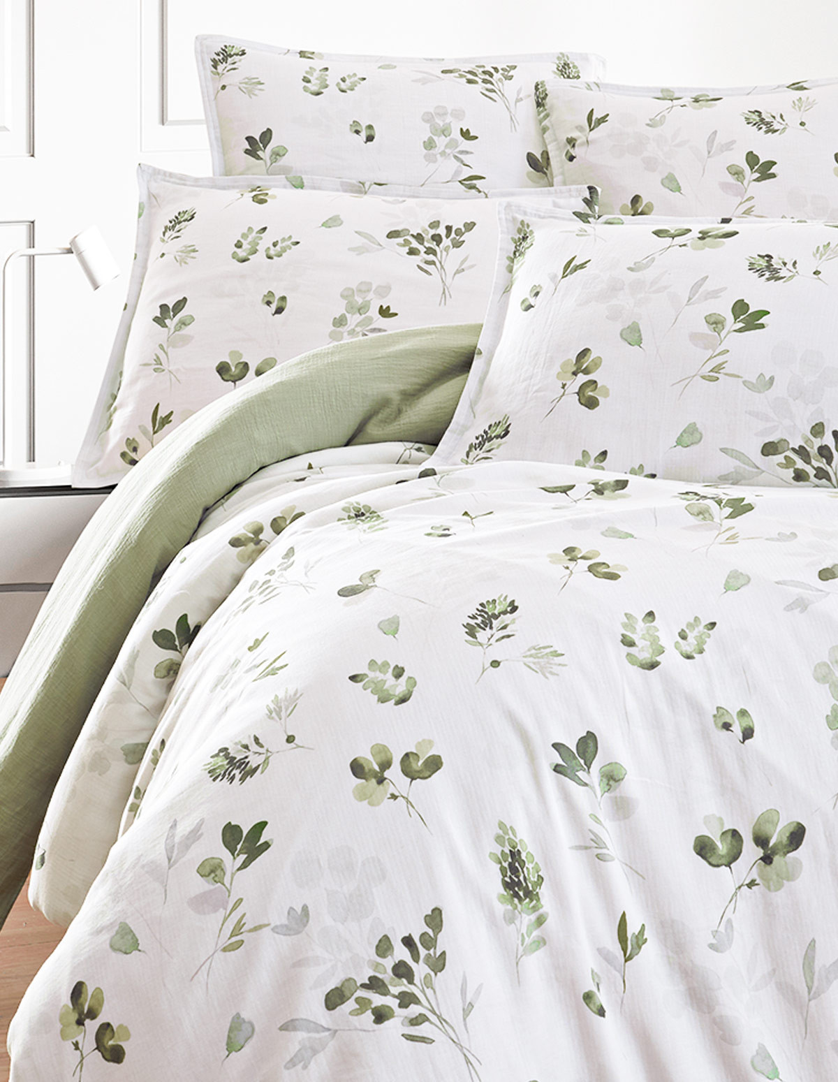 La parure housse de couette et 2 taies carrées LOLA LOFT en gaze de coton est conçue pour vous apporter douceur et fraîcheur tout au long de vos nuits, car sa composition fait de cette étoffe un véritable nuage de tendresse. Une face est composée d'un motif floral rappelant le printemps et de l'autre, un motif uni.