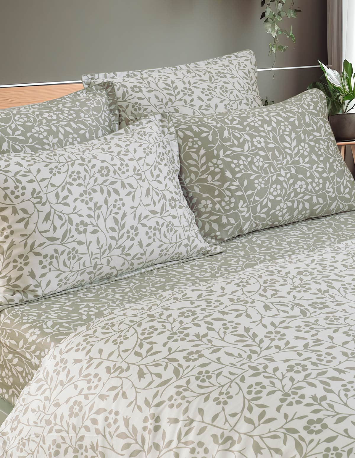 Apportez une touche de nature et de raffinement à votre chambre avec la parure de lit ELOQUENCE en satin de coton réversible. Composée d’une housse de couette et de deux taies d’oreiller carrées, elle dévoile d’un côté un motif feuillage vert sauge sur fond écru et de l’autre un motif feuillage écru sur fond vert sauge. Douce et soyeuse, elle crée une atmosphère apaisante et cocooning, idéale pour des nuits élégantes et relaxantes.