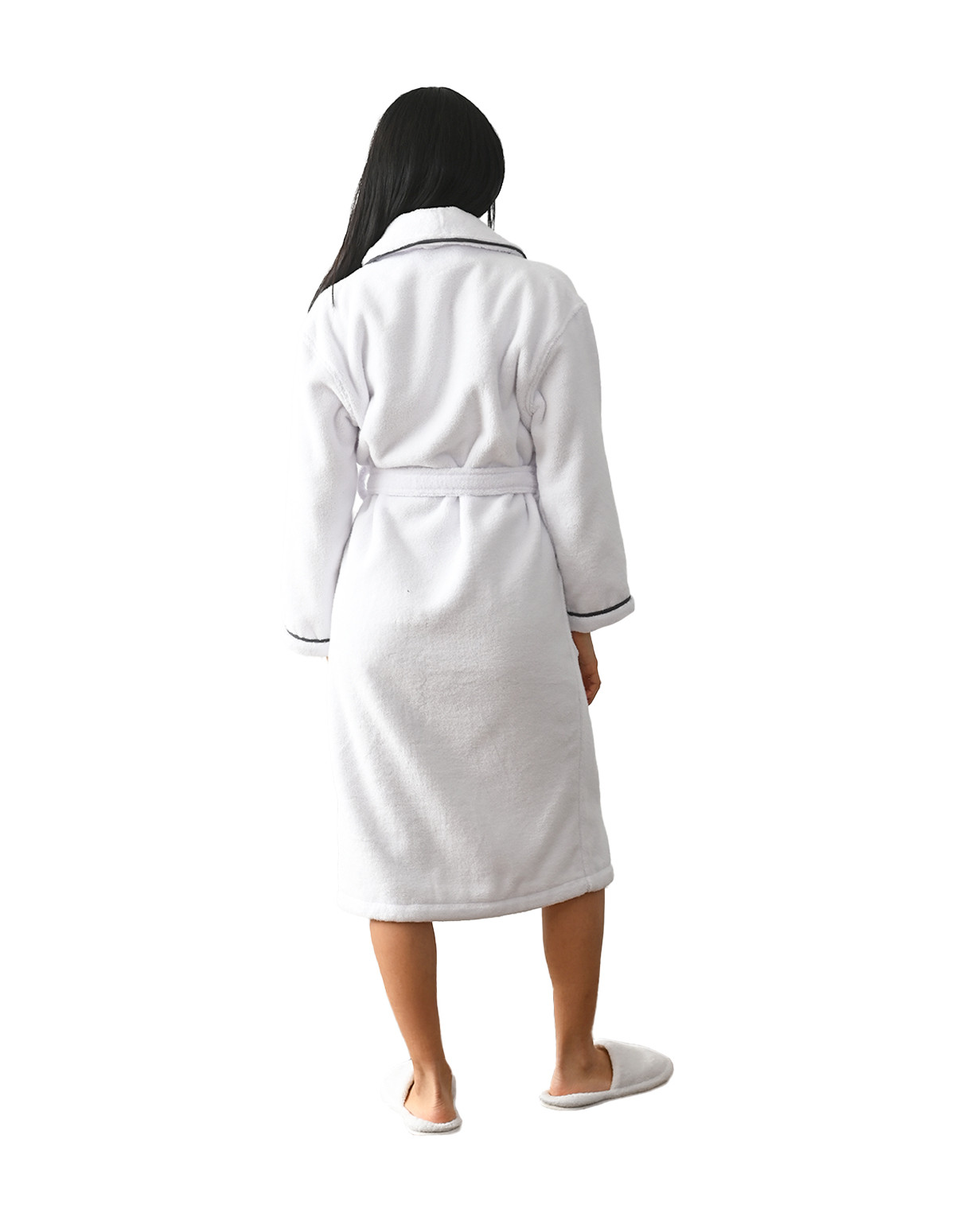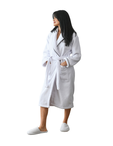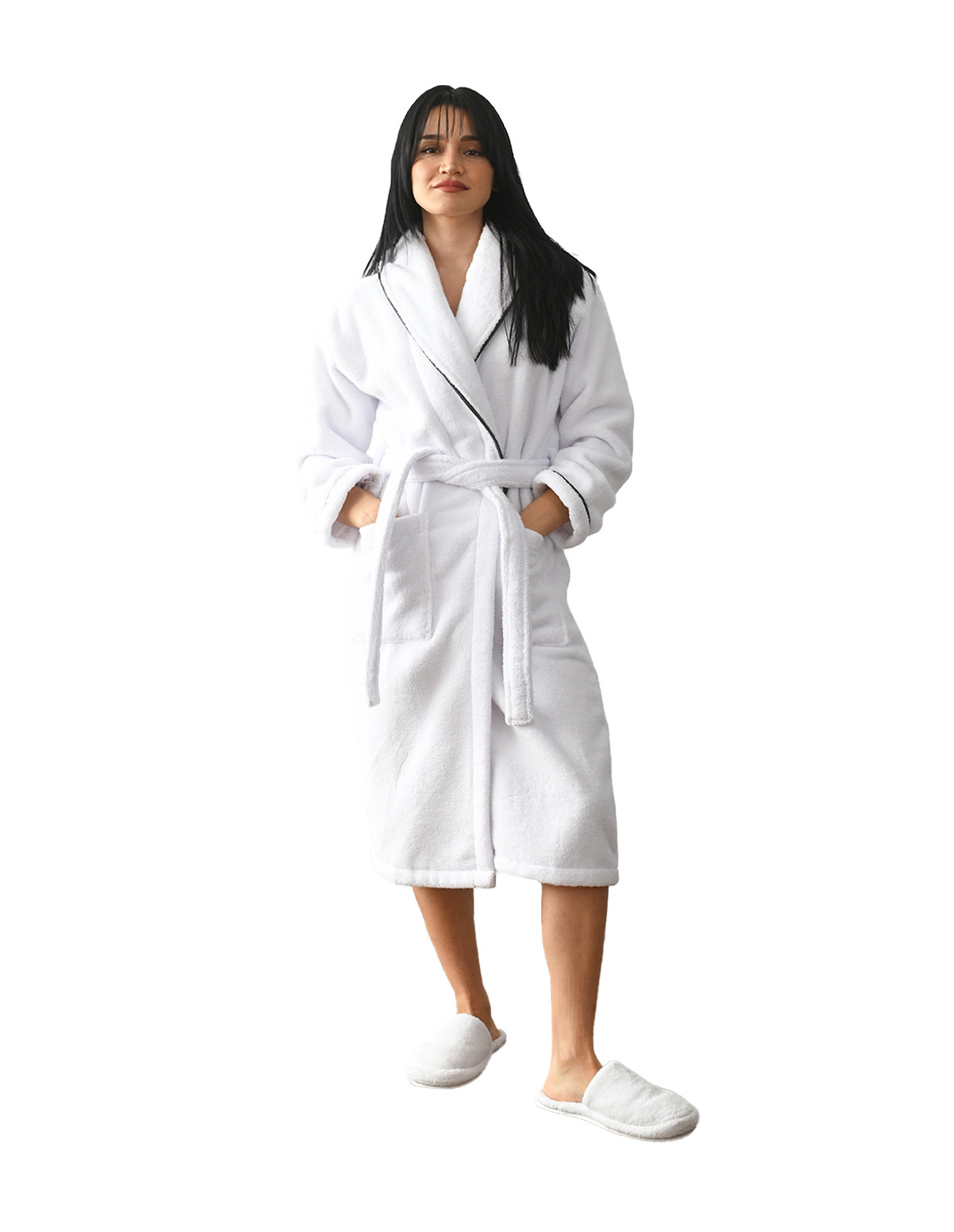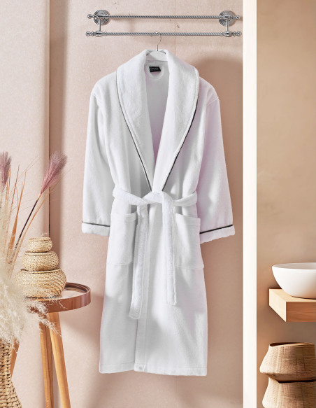 Découvrez notre peignoir de bain mixte ROSE WOOD avec son élégant passepoil au col châle et aux manches. Son design est sobre et épuré et il existe en 6 coloris mixtes.