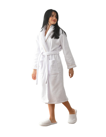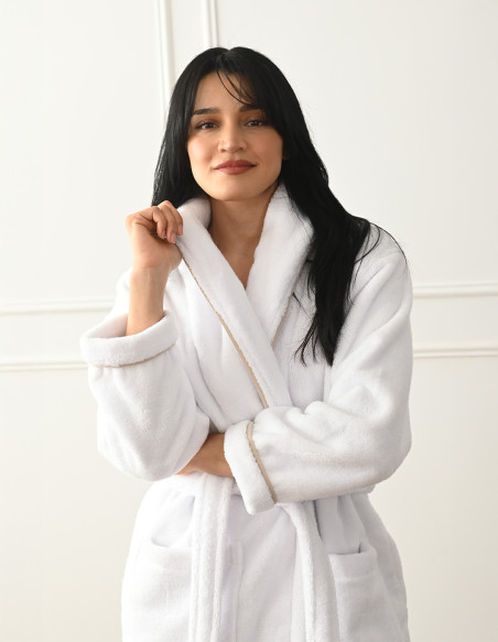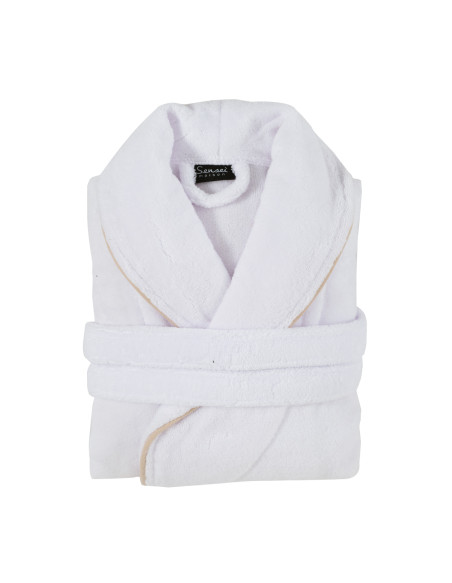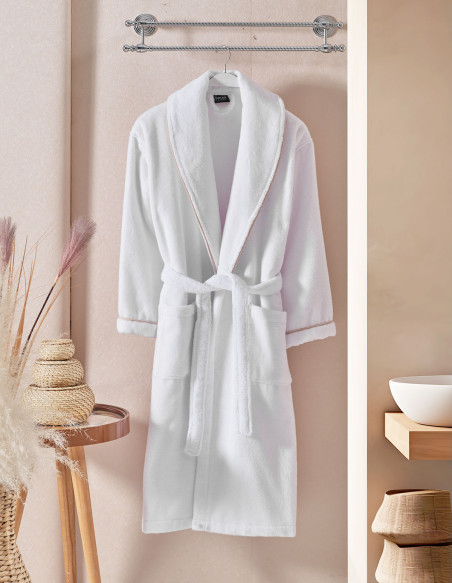 Découvrez notre peignoir de bain mixte ROSE WOOD avec son élégant passepoil au col châle et aux manches. Son design est sobre et épuré et il existe en 6 coloris mixtes.
