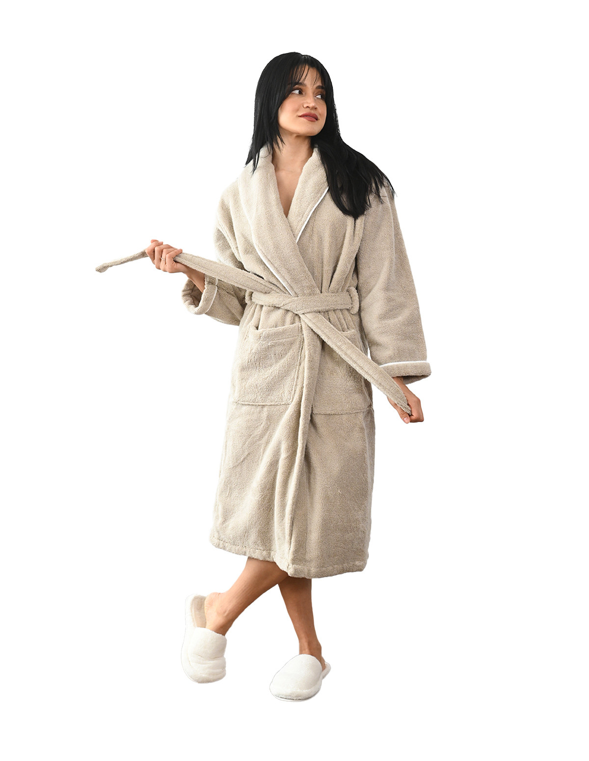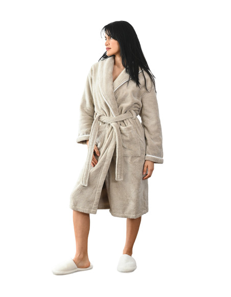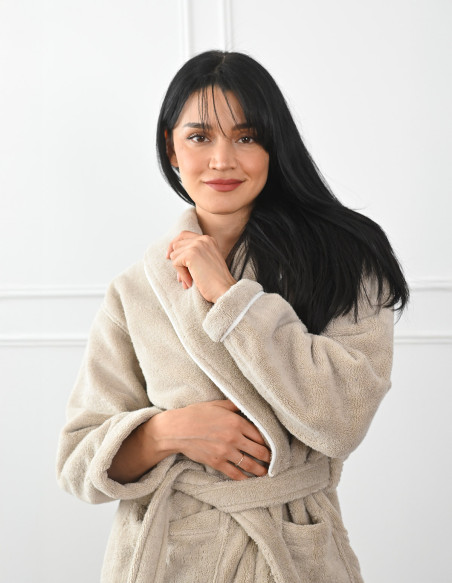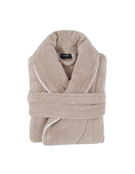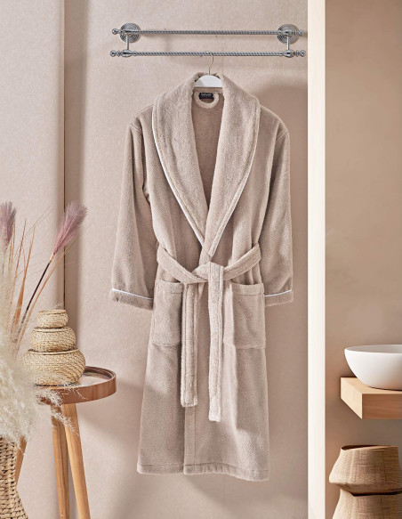 Découvrez notre peignoir de bain mixte ROSE WOOD avec son élégant passepoil au col châle et aux manches. Son design est sobre et épuré et il existe en 6 coloris mixtes.