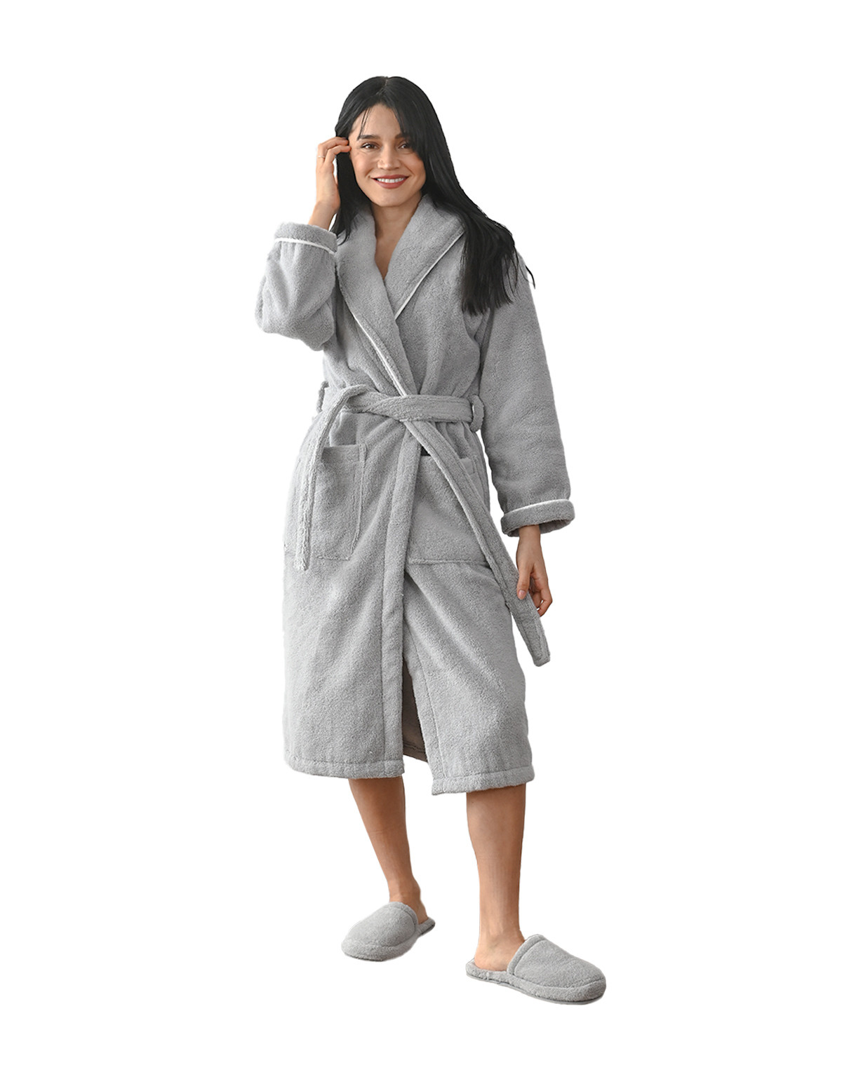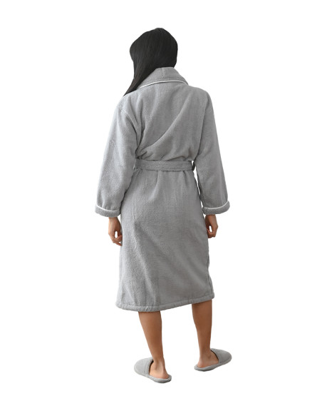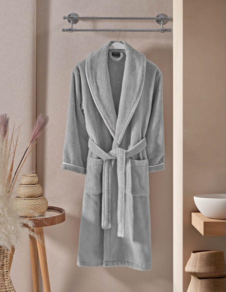 Découvrez notre peignoir de bain mixte ROSE WOOD avec son élégant passepoil au col châle et aux manches. Son design est sobre et épuré et il existe en 6 coloris mixtes.