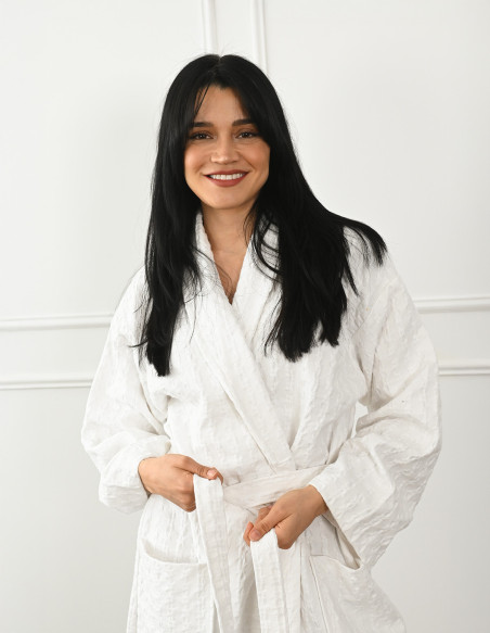 Tailles disponibles : S, M, L, XL, XXL. Grâce à sa ceinture à nouer ajustable, ce peignoir s'adapte à toutes les morphologies pour un ajustement confortable. Ce peignoir se marie parfaitement avec nos ensembles de bain pour créer une routine spa complète à la maison.