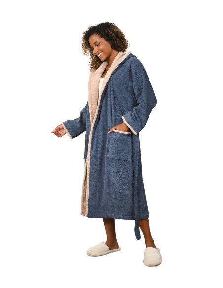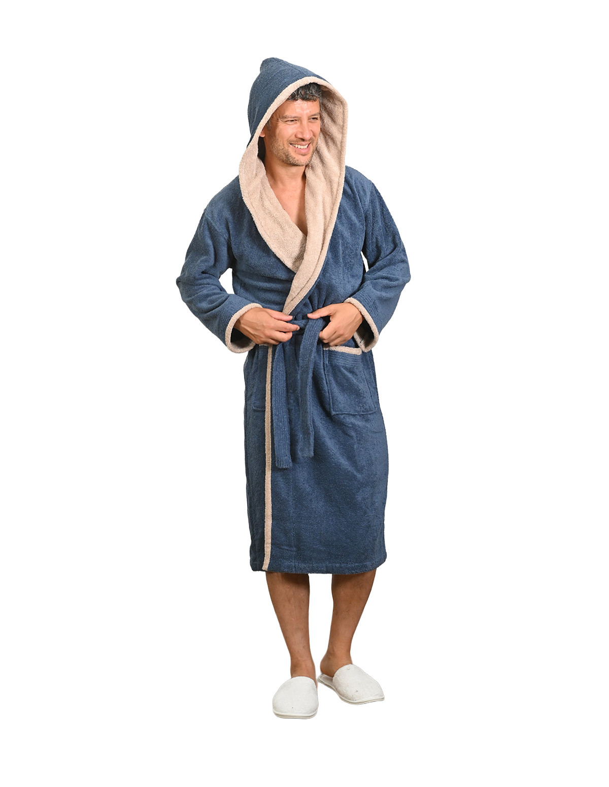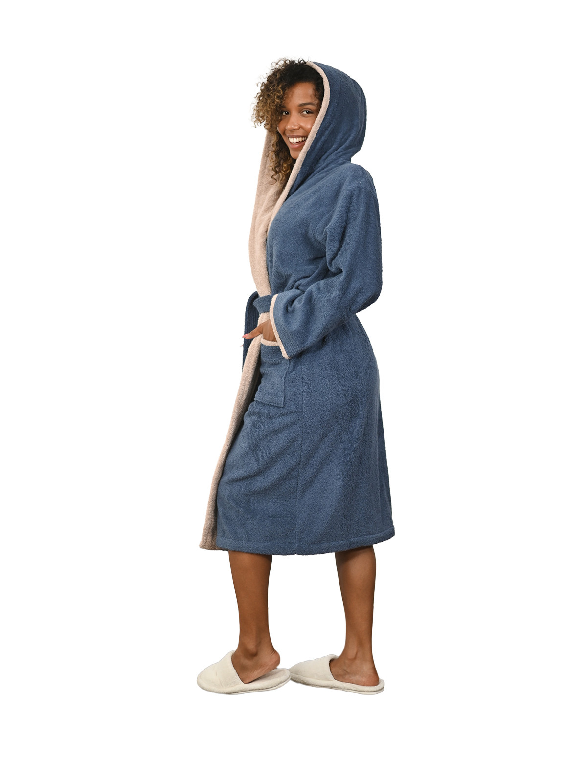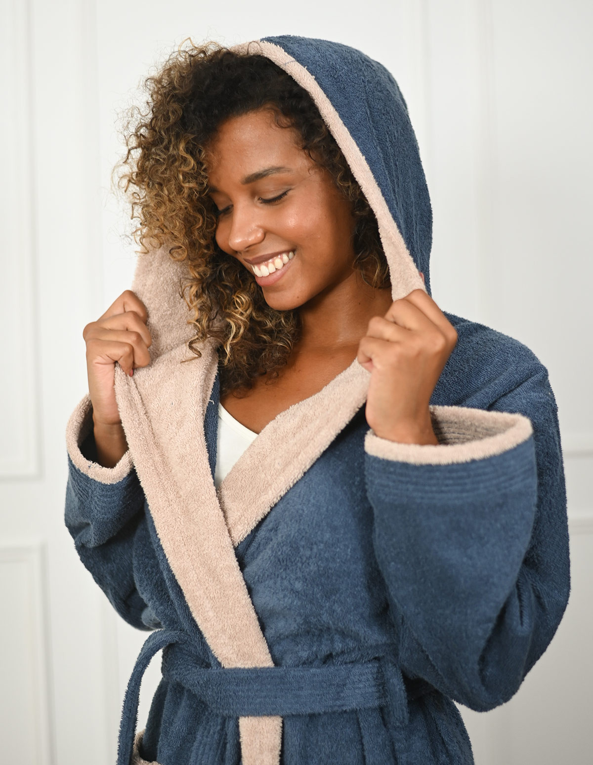Laissez-vous séduire par le peignoir adulte mixte DOZMARY à capuche bicolore. Pensé pour vous accompagner dans vos instants de détente, il vous enveloppe de douceur et de chaleur dès la sortie de la douche, du bain ou d’une séance spa.