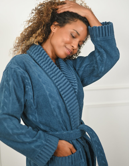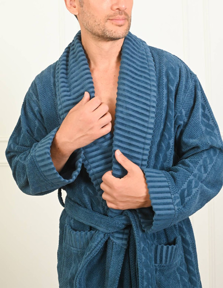 Son motif de tresses en relief, rappelant les mailles d’un pull en laine, lui confère une allure cosy et élégante. Son col rayé ton sur ton ajoute une finition discrète mais sophistiquée.