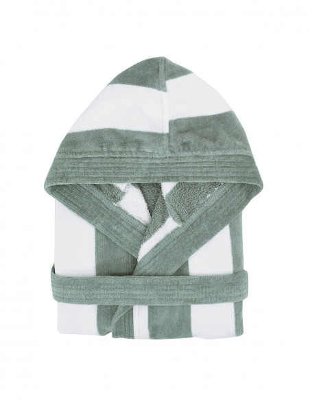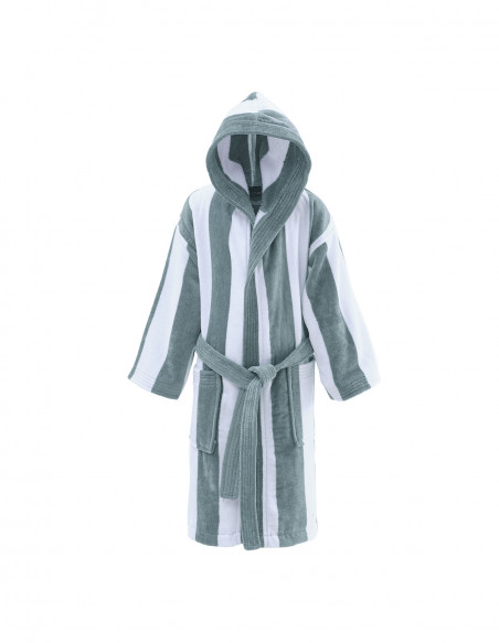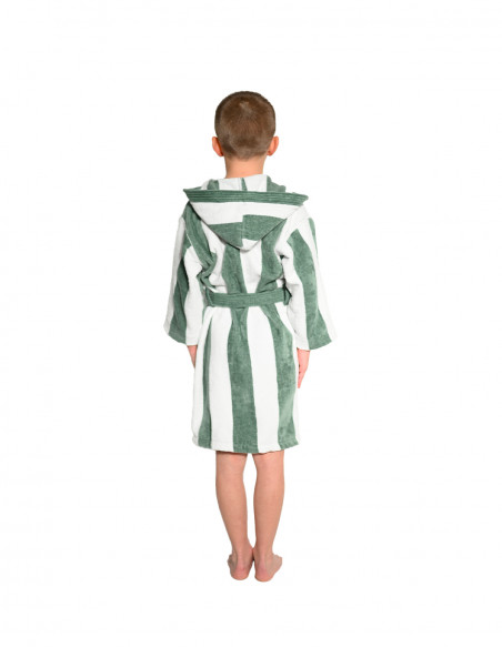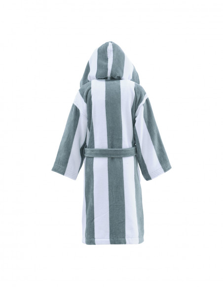 Doté de rayures aux couleurs tendances, le peignoir jacquard dispose d’une capuche, idéale pour garder la tête au chaud après les sorties de bain, de deux poches sur les côtés et d’une ceinture couse dans le dos à faire venir nouer autour de la taille. Le tissus est en éponge sur la face intérieure pour l'absorption et en velours sur la face extérieure pour plus de légèreté.