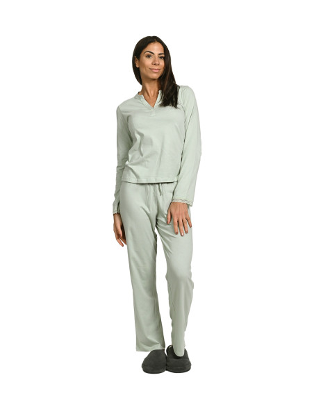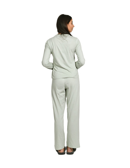 L'ensemble tee shirt à manches longues avec pantalon uni EDEN est à trouver en couleur noir ou sauge pour une composition en maille 52% coton et 48% viscose. La viscose est une fibre naturelle extraite du bois, qui donne plus de douceur et de fraîcheur au pyjama. Le pantalon dispose d'une taille en élastique avec un cordon pour le serrage ce qui le rend confortable à porter tout en restant léger.