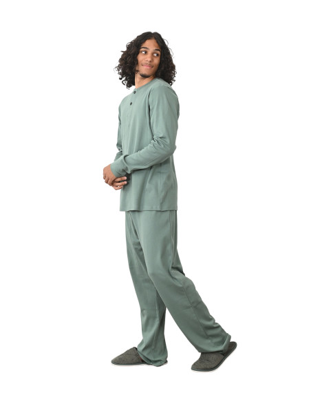 Pensé pour les hommes en quête de douceur et de liberté de mouvement, cet ensemble pyjama (t-shirt manches longues + pantalon) en jersey 100 % coton est un essentiel de la détente. Léger, respirant et agréable à porter, il se compose d’un t-shirt col rond avec boutons et de manches longues avec un pantalon souple ajustable à la taille avec un cordon. Un basique intemporel à adopter sans hésitation.