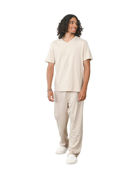 Pensé pour les hommes en quête de douceur et de liberté de mouvement, cet ensemble pyjama (t-shirt + pantalon) en jersey 100 % coton est un essentiel de la détente. Léger, respirant et agréable à porter, il se compose d’un t-shirt col V à manches courtes et d’un pantalon souple ajustable à la taille avec un cordon. Un basique intemporel à adopter sans hésitation.