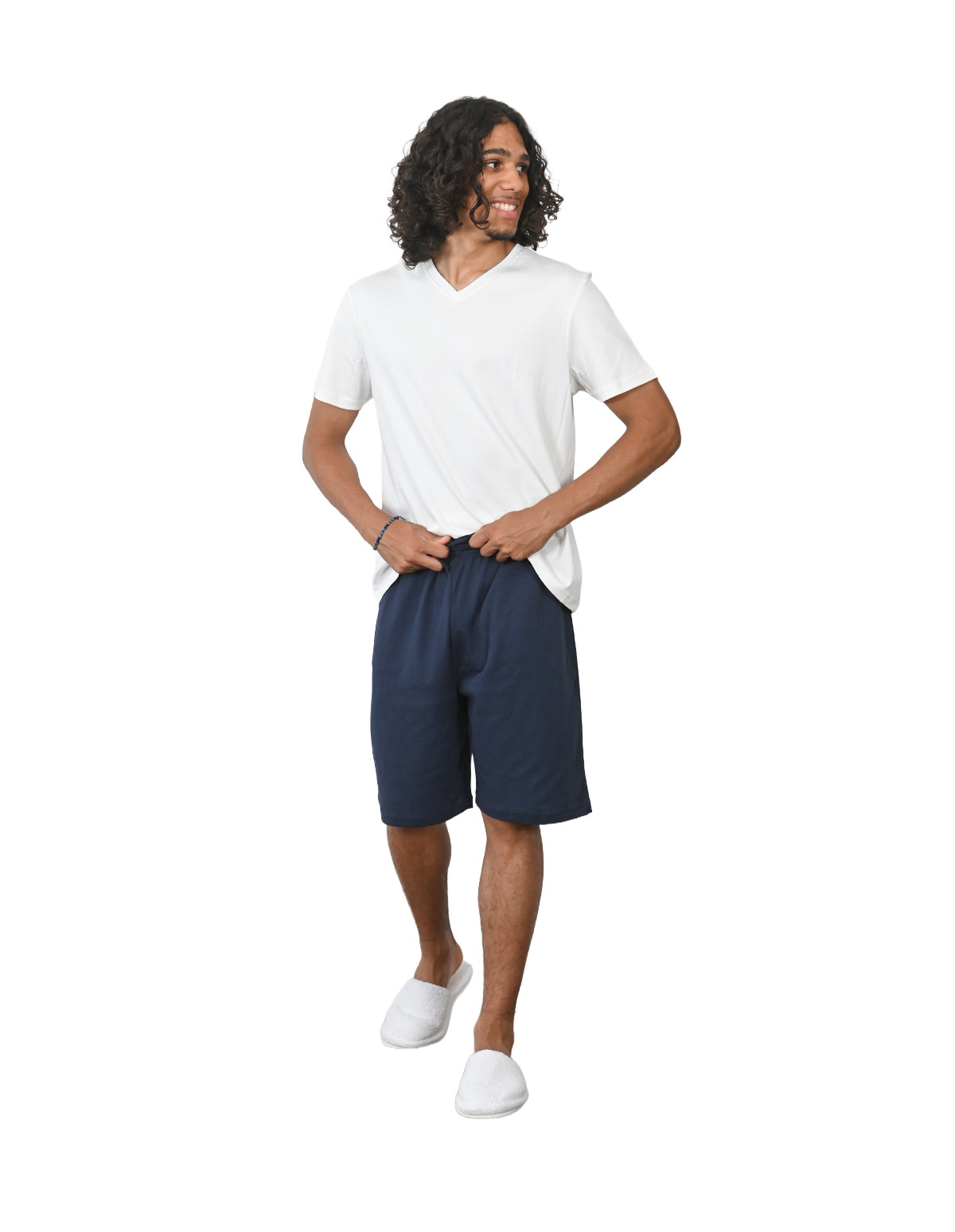 Pensé pour les hommes en quête de douceur et de liberté de mouvement, cet ensemble pyjama (t-shirt + short) en jersey 100 % coton est un essentiel de la détente. Léger, respirant et agréable à porter, il se compose d’un t-shirt col V à manches courtes et d’un short souple ajustable avec un cordon. Un basique intemporel à adopter sans hésitation.