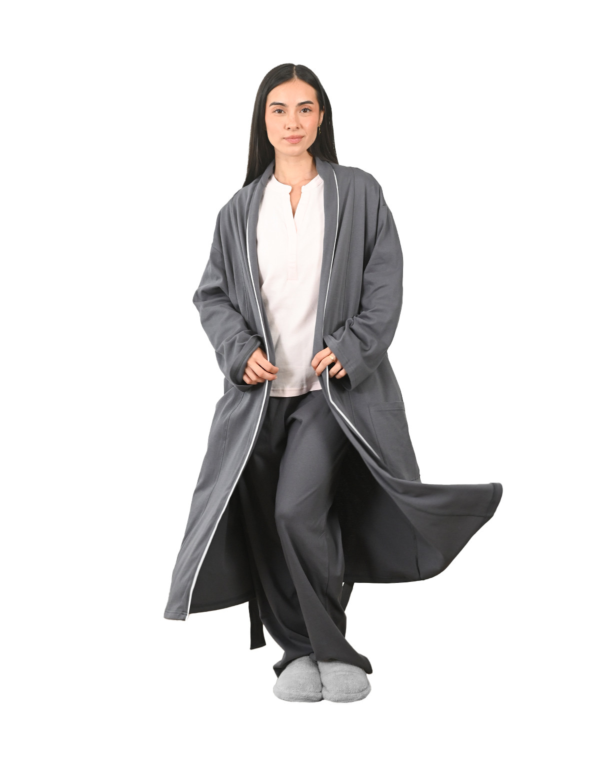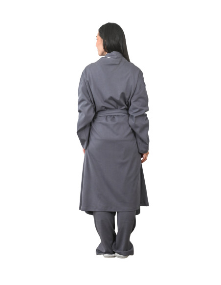 Avec son design mixte et généreux, cette robe de chambre s'adapte harmonieusement à toutes les morphologies. Le passepoil contrasté apporte une touche de sophistication subtile, tandis que la coupe soignée garantit un confort optimal au quotidien.