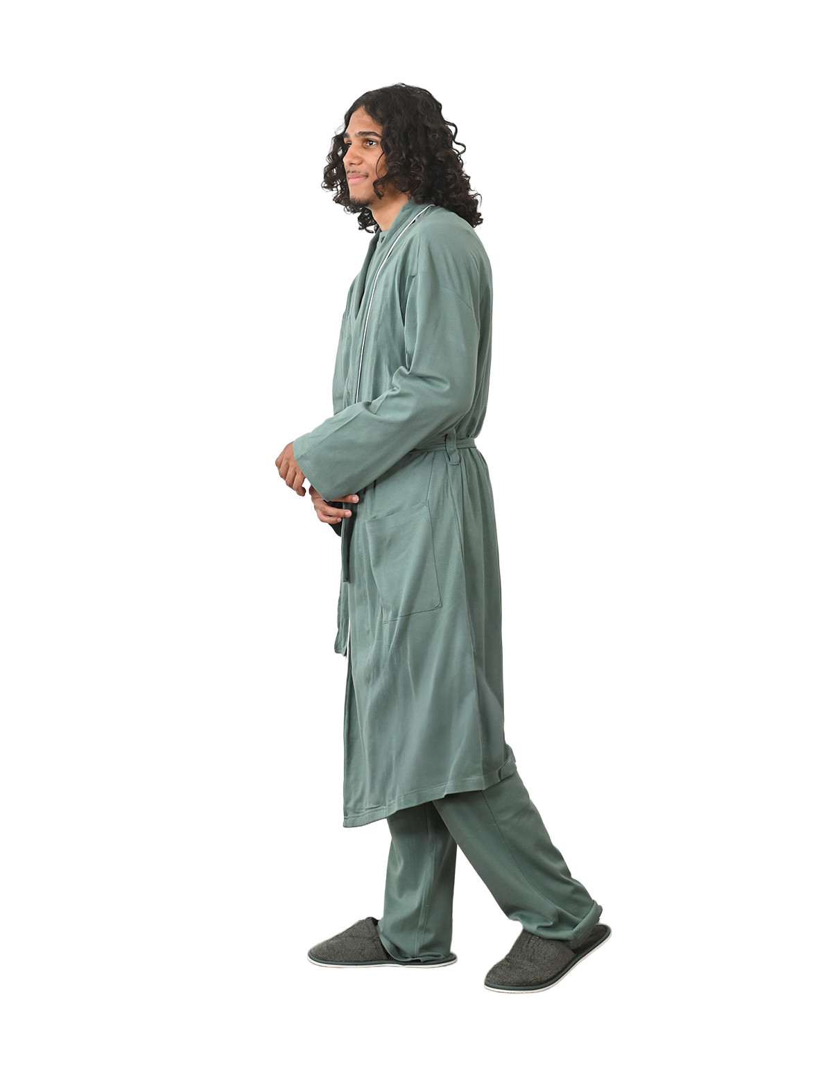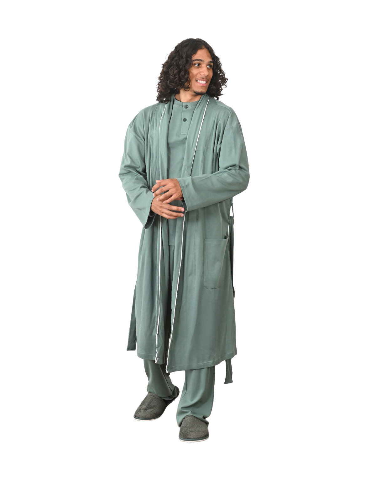 Avec son design mixte et généreux, cette robe de chambre s'adapte harmonieusement à toutes les morphologies. Le passepoil contrasté apporte une touche de sophistication subtile, tandis que la coupe soignée garantit un confort optimal au quotidien.