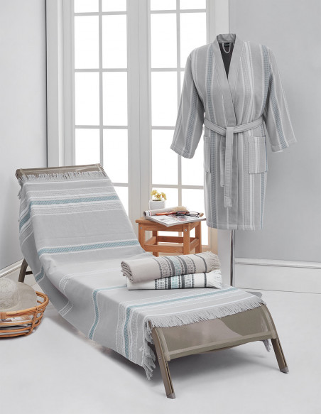 Notre fouta est tissée en une face lisse pour plus de légèreté et une face éponge pour plus d'absorption. Son poids en 330 g/m² lui permet de ne pas prendre trop de place dans votre sac ou valise, et d'être très confortable à utiliser.