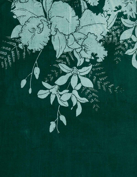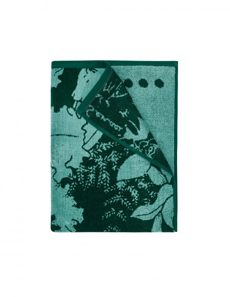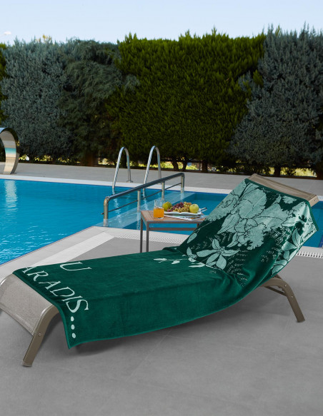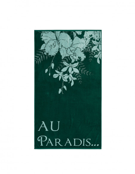 PARADIS, c’est le thème de cette serviette de plage en velours jacquard. Dominée par une teinte de vert, elle est 100% coton, grande (100x180cm) et assure une absorbation ultra-efficace (420gr/m²).