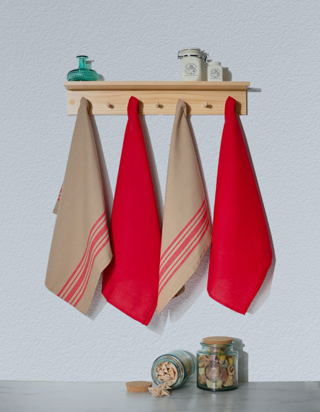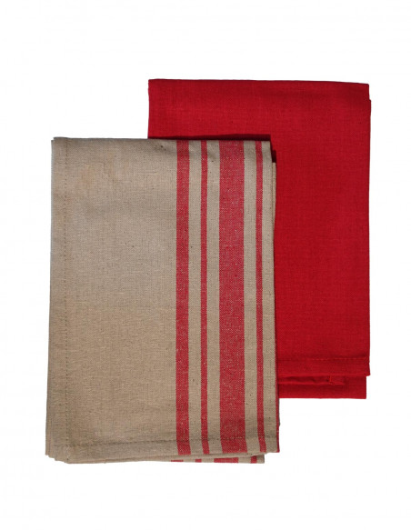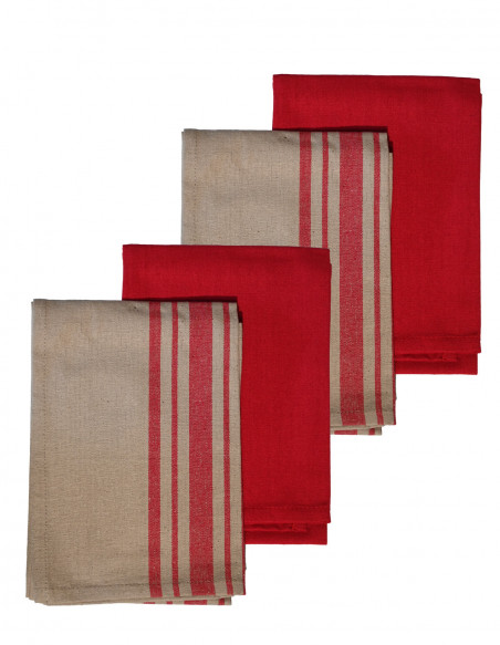 Le lot est composé de 2 torchons unis et de 2 torchons à rayures qui sont tissés teints.