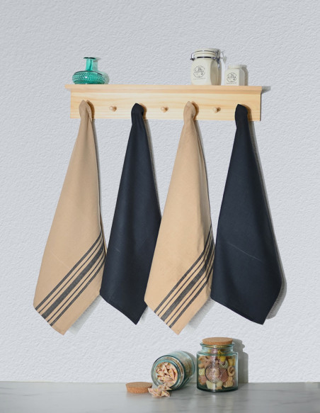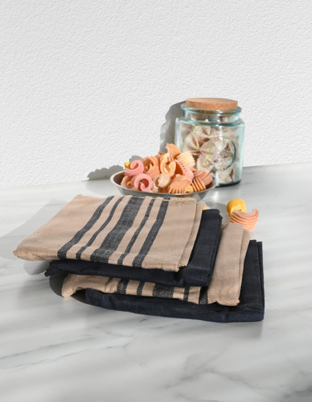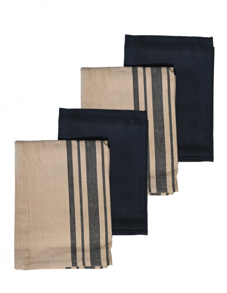 Le lot est composé de 2 torchons unis et de 2 torchons à rayures qui sont tissés teints.